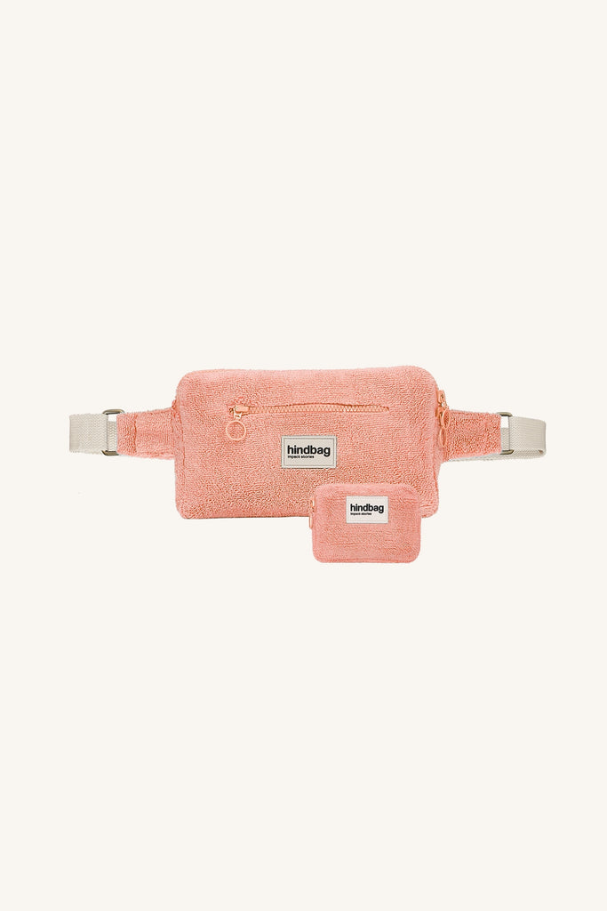 Entdecken Sie unsere Taschen und Accessoires aus GOTS-zertifiziertem Bio-Baumwollfrottee , erhältlich in Korallenrosa, Mandelgrün und Wolkenblau . Ein weiches und saugfähiges Material, das Funktionalität und Eleganz vereint und Sie den ganzen Sommer über begleitet.