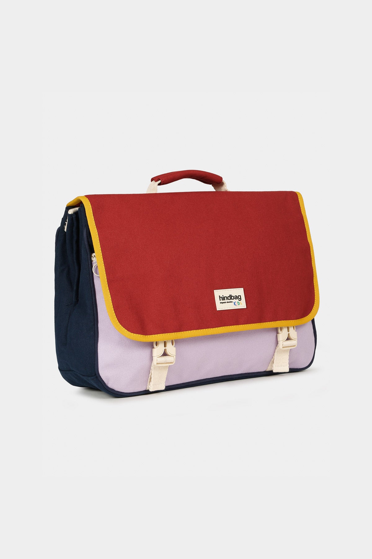 Inside, the two compartments, separated by a zipped pocket and the front patch pocket, allow you to organize the storage of A4 binders and notebooks, pencil cases, and snacks. Thanks to its organic cotton, this satchel is lightweight, but also rain-resistant, as the fabric is water-repellent. A ring on the side allows you to optionally attach the Billy accessory, a clever treasure pouch with a reflective side for added safety.