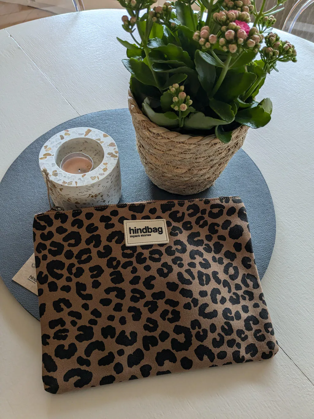 Trousse à fermeture éclair en coton bio de couleur cannelle avec imprimés léopard