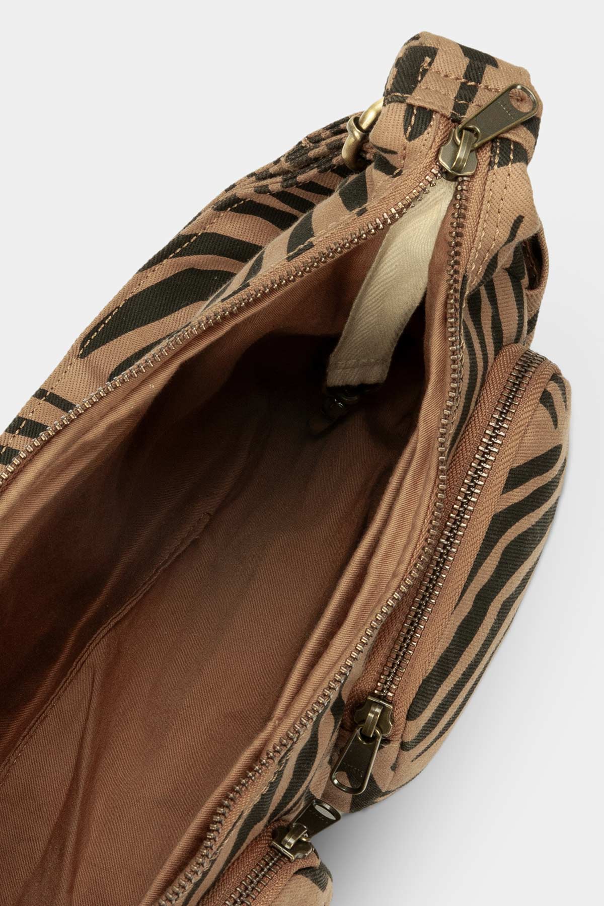 Le sac multipocket en coton bio imprimé zèbre couleur Cannelle